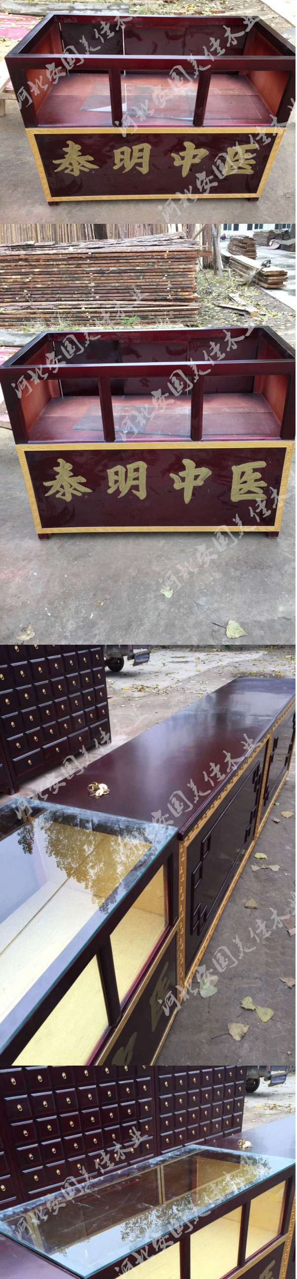 中藥柜展示臺用料---框架和抽屜選用優(yōu)質(zhì)樟松木,抽屜下面有五合板封底,防串味,抽屜底選用七合板,中藥柜的后背兩側(cè)頂部選用七合板。