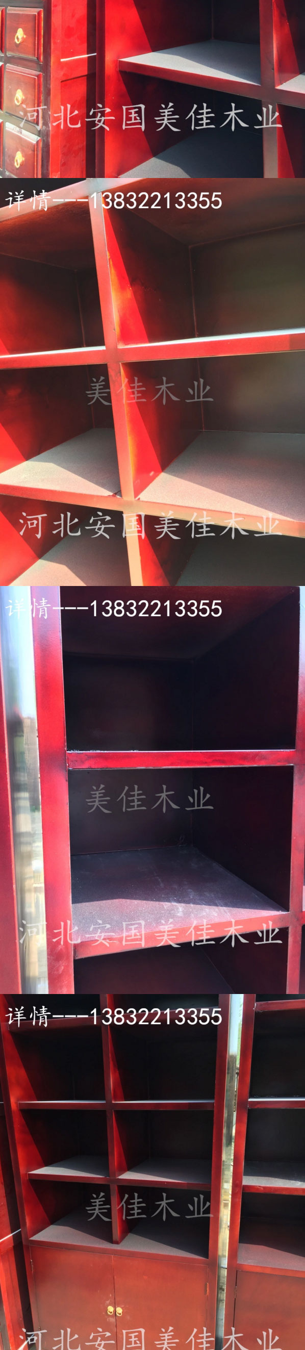 中藥柜展示臺(tái)用料---框架和抽屜選用優(yōu)質(zhì)樟松木,抽屜下面有七合板封底,防串味,抽屜底選用九厘板,中藥柜的后背兩側(cè)頂部選用七合板。