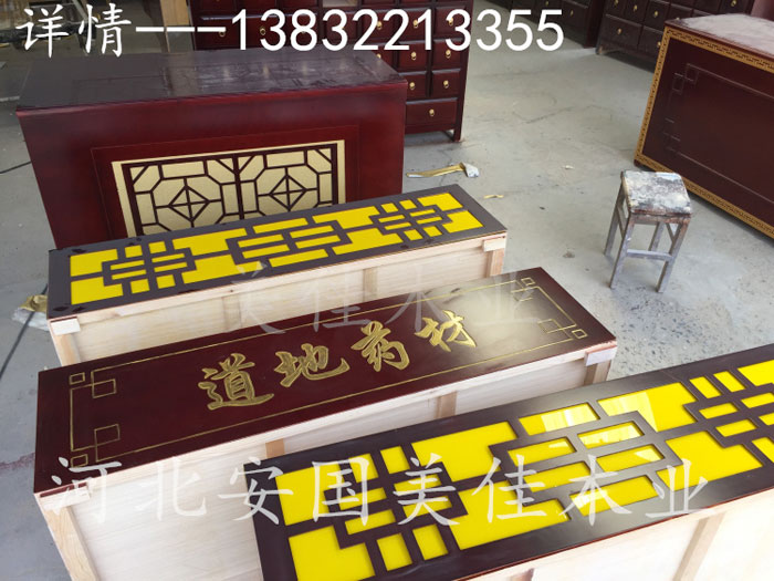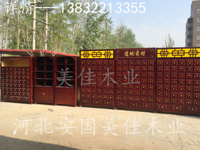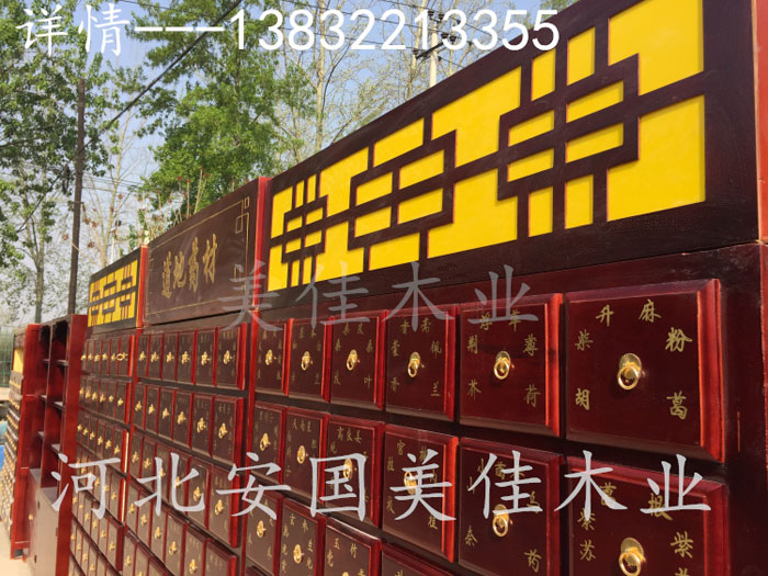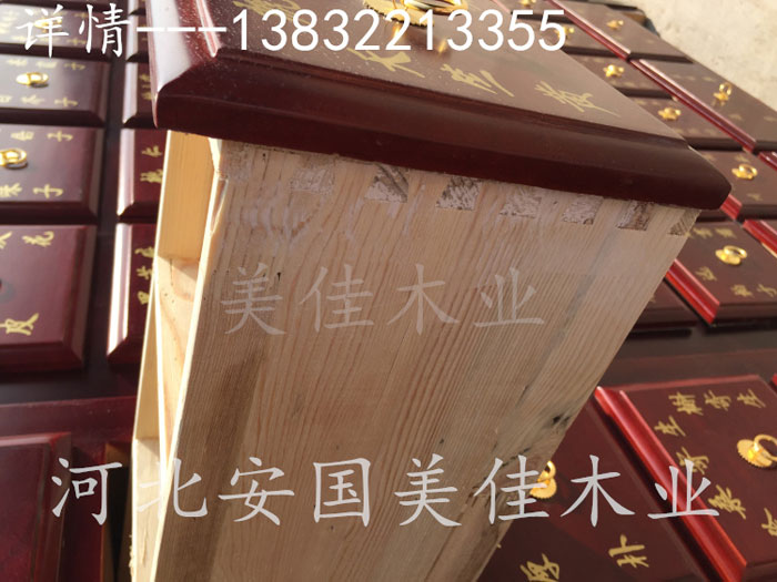 中藥柜尺寸---高220公分,寬150公分,厚60公分。抽屜面尺寸:寬18公分,高16公分。厚度18公分。中藥柜用料---框架和抽屜選用優質樟松木,抽屜下面有五合板封底,防串味,抽屜底選用七合板,中藥柜的后背兩側頂部選用七合板。中藥柜款式---橫六豎八款。橫著六個抽屜,豎著八層抽屜,較下面的三個大抽屜。根據客戶要求定做。中藥柜顏色---經典琥珀色花紋烤漆。燈箱外邊雕刻花型。中藥柜用漆---亮光或者半啞環保聚脂漆水房烤漆。中藥柜拉環---超精致純銅拉環。