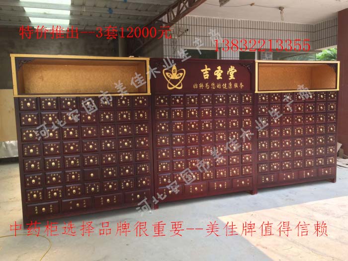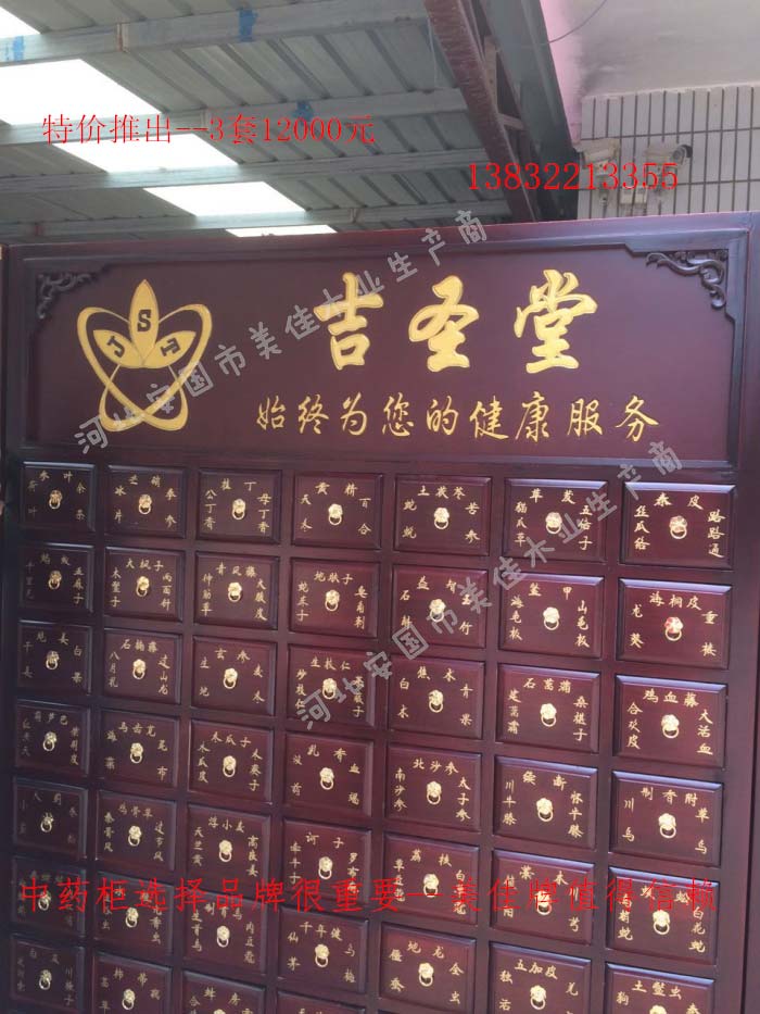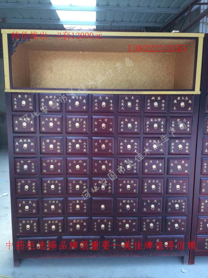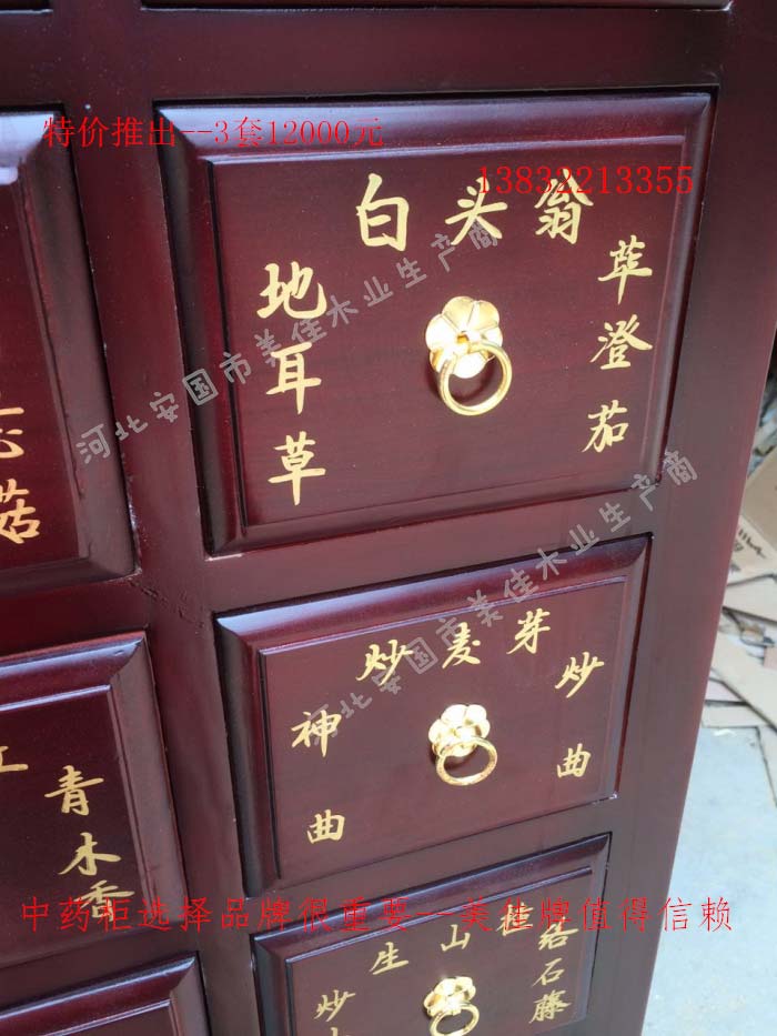 中藥柜尺寸---高215公分,寬170公分,厚60公分。抽屜面尺寸:寬18公分,高17公分。高度15公分。中藥柜用料---框架和抽屜選用優質樟松木,抽屜下面有五合板封底,防串味,抽屜底選用九厘板,中藥柜的后背兩側頂部選用五合板。中藥柜款式---橫七豎八款。橫著七個抽屜,豎著八層抽屜,較下面的四個大抽屜,每個抽屜兩味藥,每個中藥柜可以裝155味藥。中藥柜顏色---經典仿紅木色亮光花紋烤漆。中藥柜用漆---亮光或者半啞環保聚脂漆水房烤漆。中藥柜拉環---超精致純銅拉環。