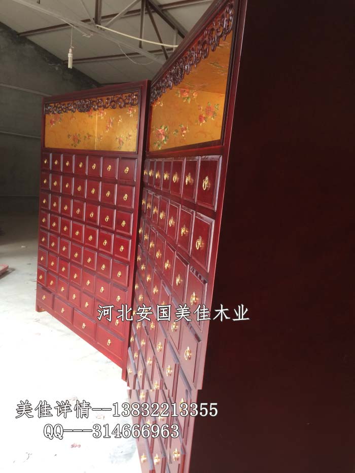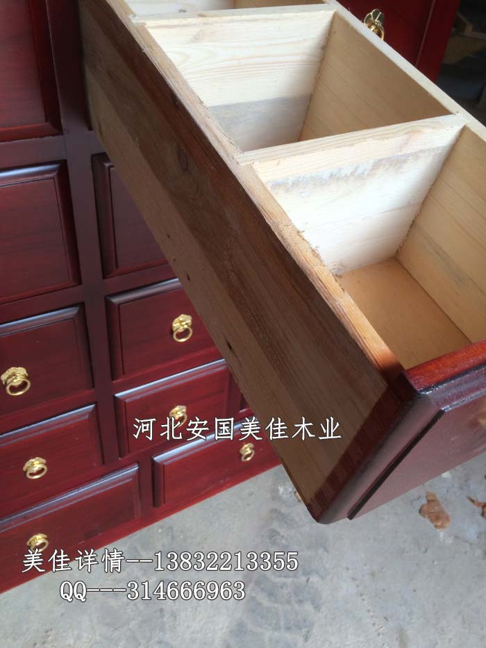 中藥柜尺寸---高215公分,寬170公分,厚60公分。抽屜面尺寸:寬18公分,高15公分。厚度17公分。中藥柜用料---框架和抽屜選用優質樟松木,抽屜下面有五合板封底,防串味,抽屜底選用九厘板,中藥柜的后背兩側頂部選用五合板。中藥柜款式---橫七豎八款。橫著七個抽屜,豎著八層抽屜,較下面的四個大抽屜,每個抽屜兩味藥,每個中藥柜可以裝155味藥。中藥柜顏色---經典仿紅木色花紋烤漆。中藥柜用漆---亮光或者半啞環保聚脂漆水房烤漆。中藥柜拉環---超精致純銅拉環。