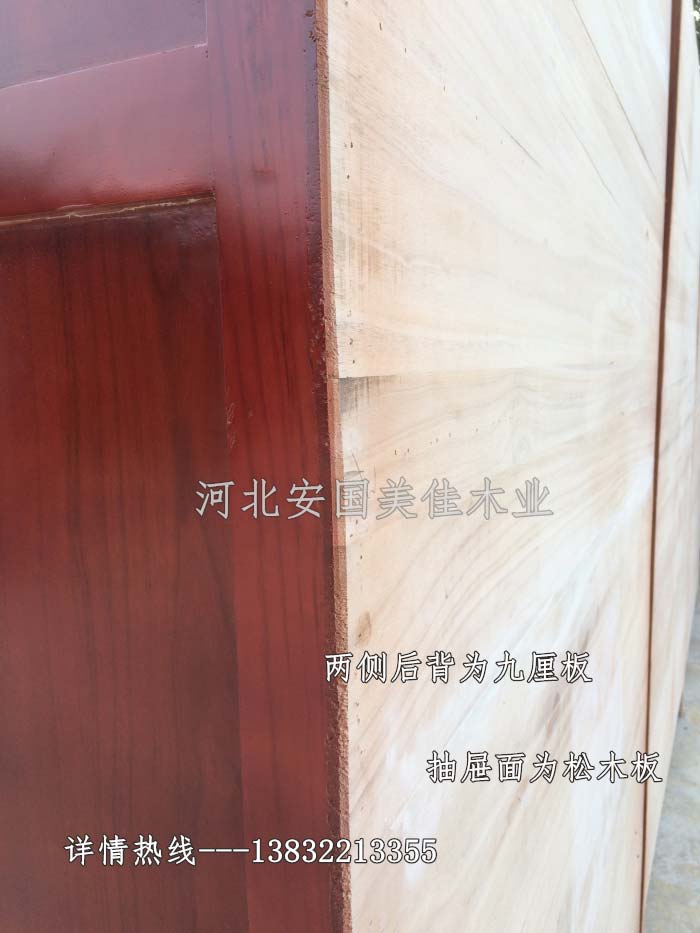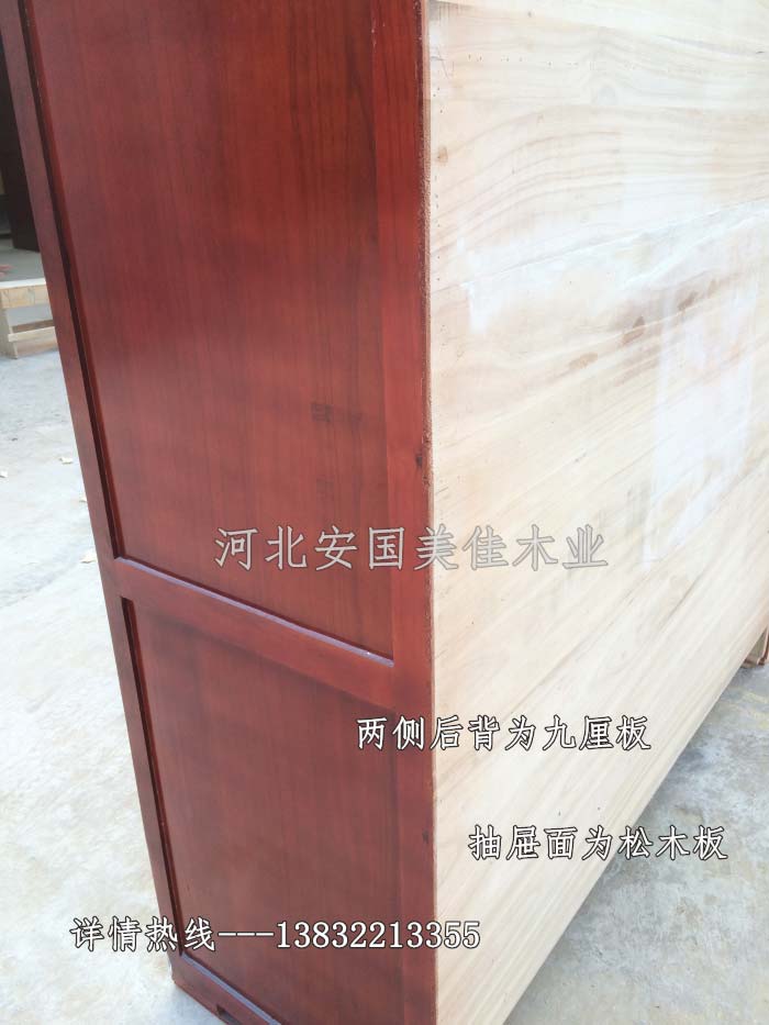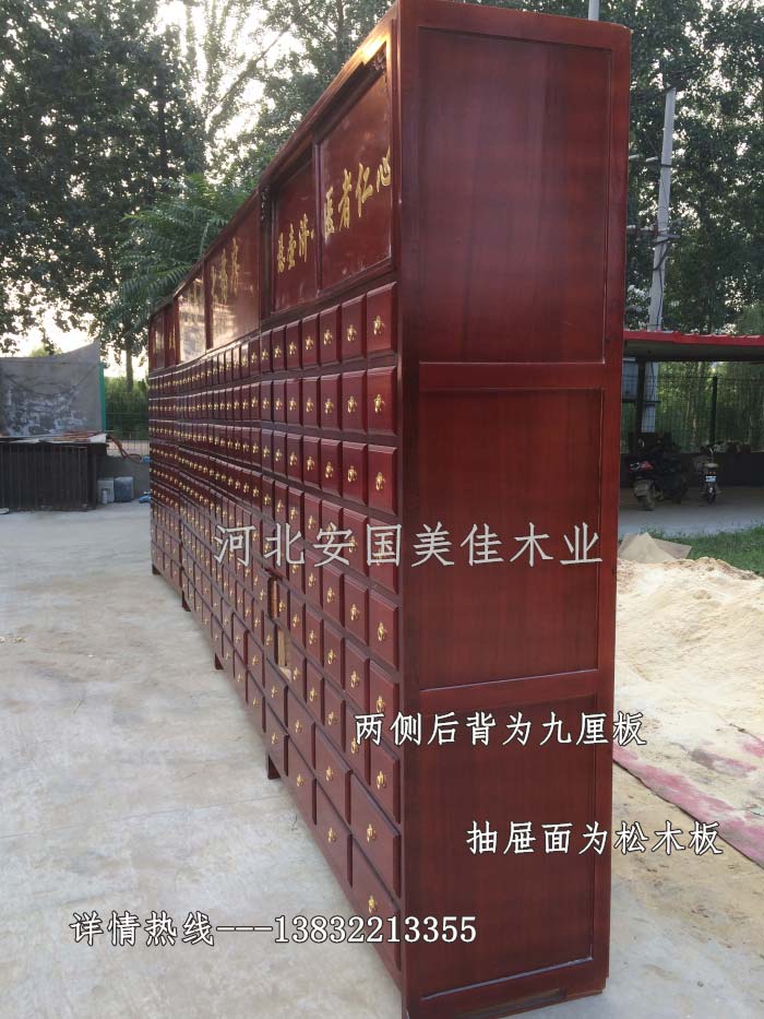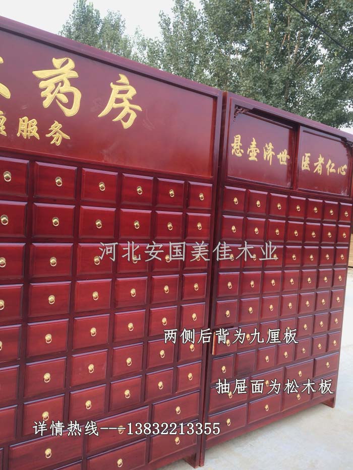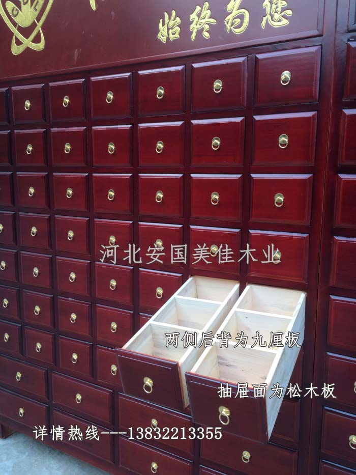 中藥柜用料---框架和抽屜選用優(yōu)質(zhì)樟松木,抽屜下面有五合板封底,防串味,抽屜底選用七合板,中藥柜的后背兩側(cè)頂部選用九厘板。抽屜面為松木整塊板。
