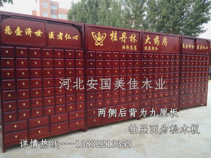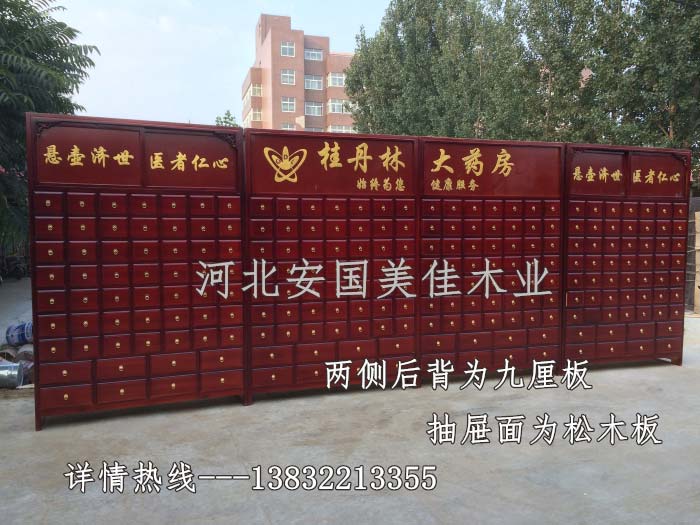 中藥柜款式---橫七豎九款。橫著七個抽屜,豎著七層抽屜,較下面為兩排大抽屜,每個抽屜兩味藥,每個中藥柜可以裝163味藥。
